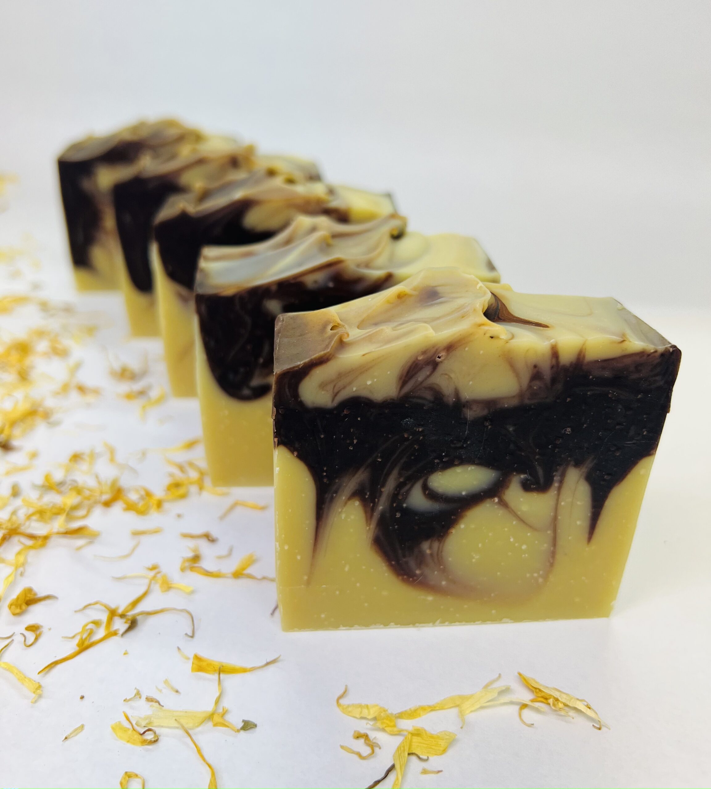 Ingredients: Sodium Olivate, Sodium Cocoate, Sodium Cocoa Butterate, Aqua, Sodium Sweet Almondate, Sodium Macadamiate, Calendula Officinalis Flower Extract, Theobroma Cacao Seed Powder, Eucalyptus Globulus Leaf Oil, Eugenia Caryophyllus Bud Oil, Melissa Officinalis Leaf Oil, *Limonene, *Beta-Caryophyllene, *Eugenol, *Citronellol, *Geraniol